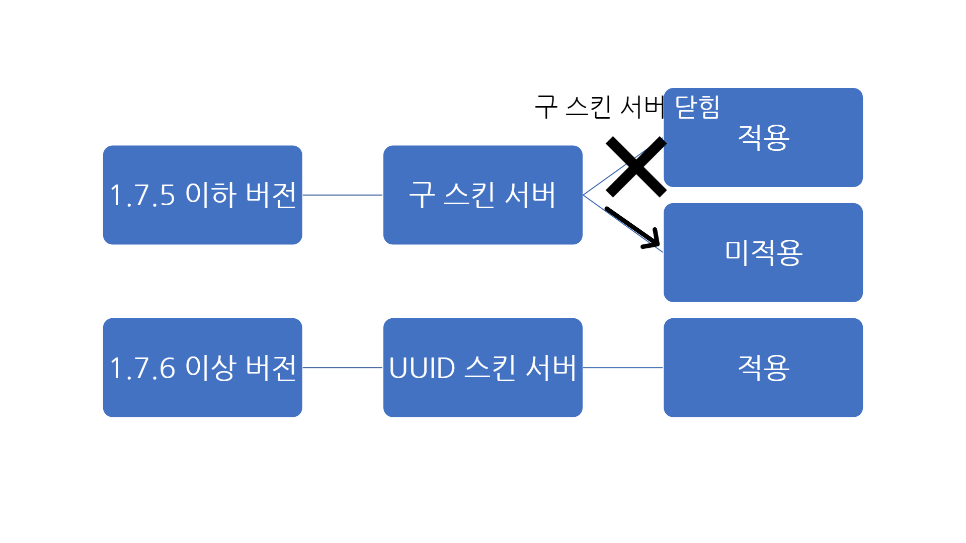 1.7.5 이하의 버전에서 스킨이 보이지 않는 이유는 모장이 2월부터 구 스킨 서버를 닫았기 때문입니다. 1.7.5 이하 버전은 플레이어의 유저 네임에 따라 구 스킨 서버에서 스킨을 적용해줬습니다. 하지만 1.7.6부터 UUID가 도입되어 각 구매 계정마다 자동으로 할당된 플레이어의 UUID에 따라 신 스킨 서버에서 스킨을 적용하게 됐습니다. 따라서 구 스킨 서버를 사용하는 1.7.5 이하 버전들은 스킨이 보이지 않게 된 것입니다.
