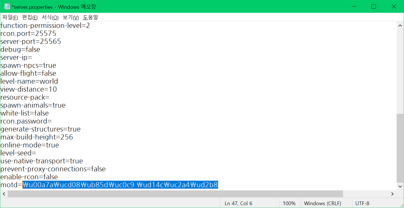 서버를 설명할 때 쓰이는 서버 motd에는 기본적으로 영어와 숫자, 일부 특수기호만 적을 수 있습니다.