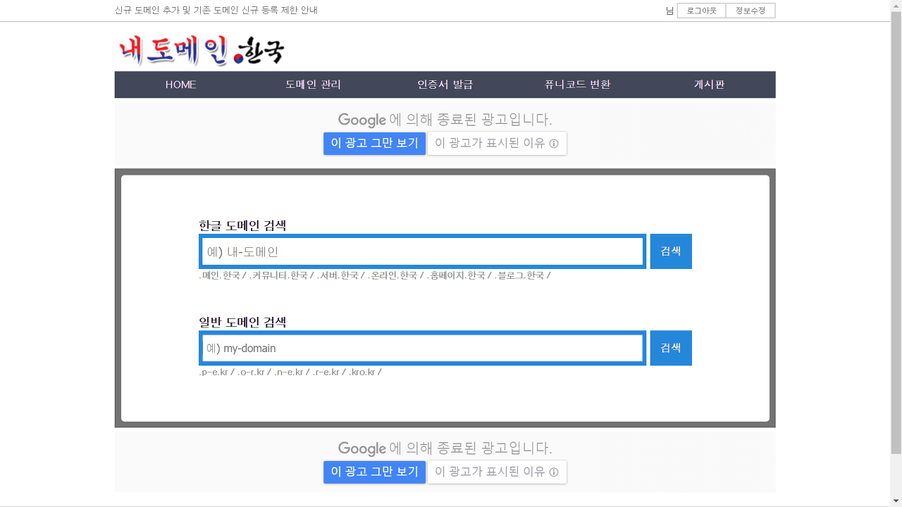 내도메인.한국 사이트에 접속해 오른쪽 위의 회원가입 버튼을 눌러 회원가입을 해준 후 로그인합니다.