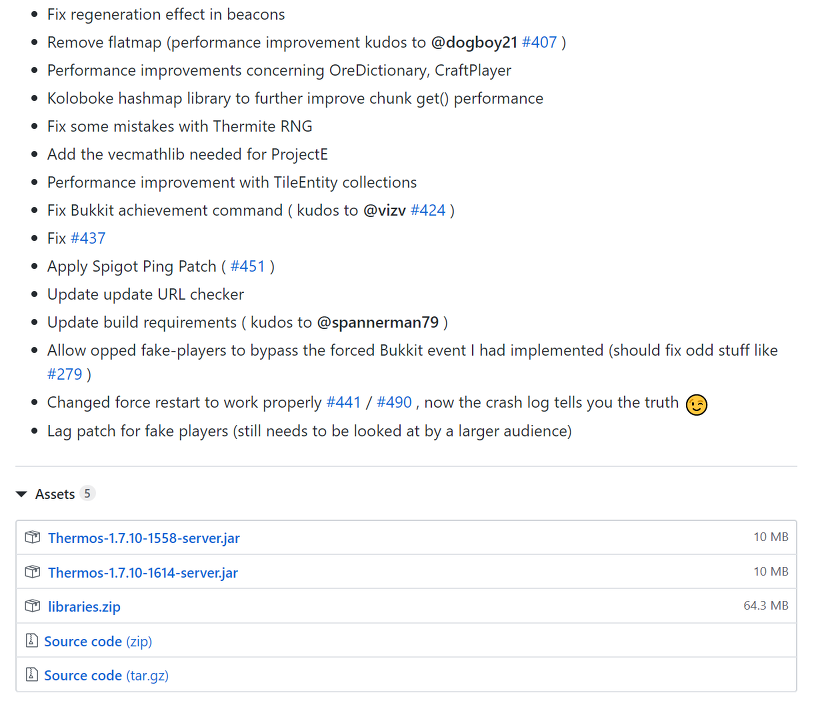 Thermos 공식 GitHub 다운로드 페이지에 들어가 Thermos Build 58 (ALPHA) 하단의 Assets를 눌러 파일들을 보이게 한 후 libraries.zip과 Thermos-1.7.10-1558-server (최신 Forge 버전)또는 Thermos-1.7.10-1614-server (권장 Forge 버전)를 다운로드해 줍니다.
