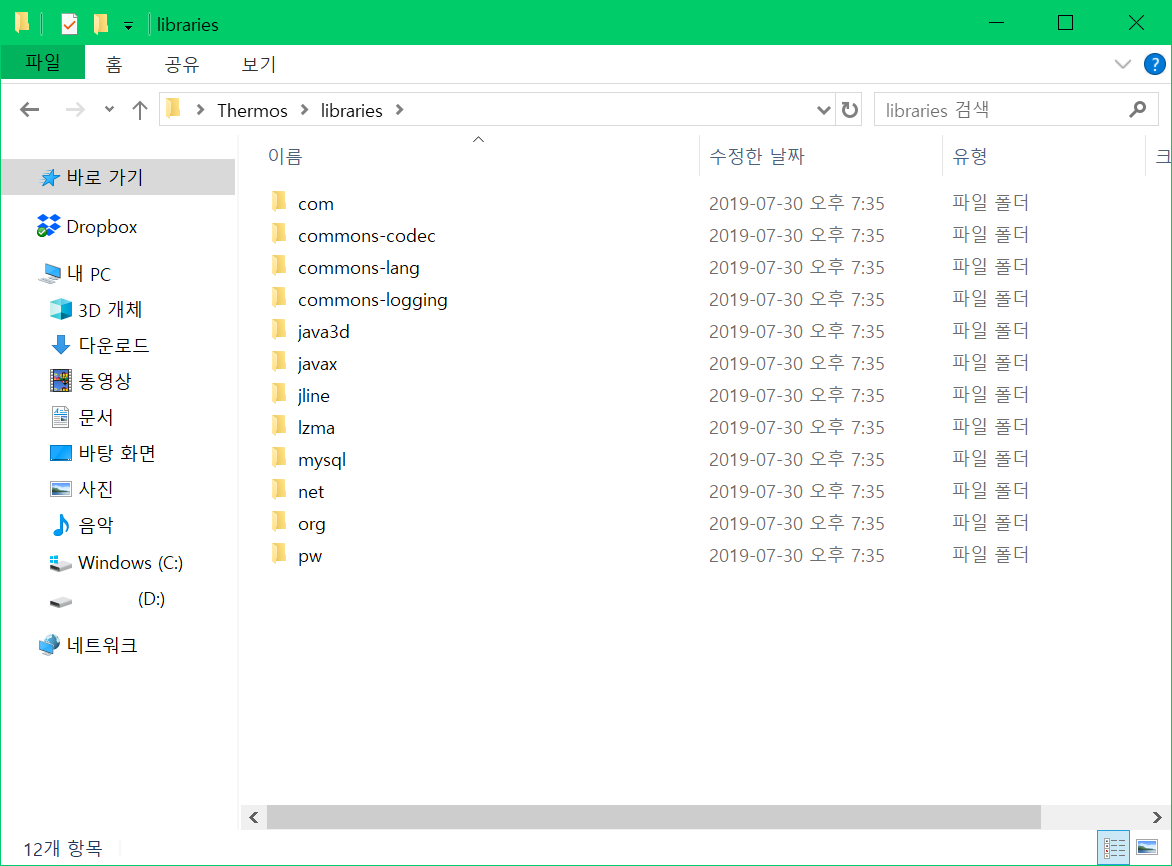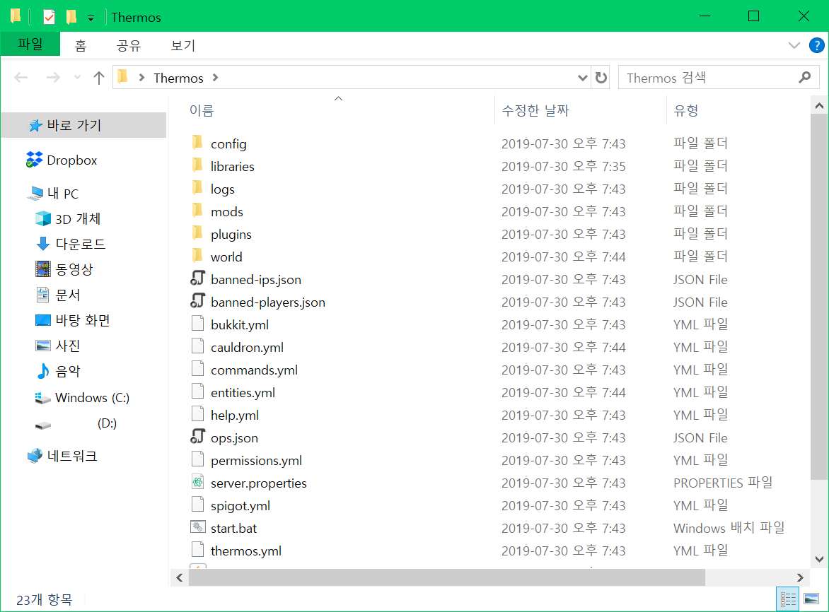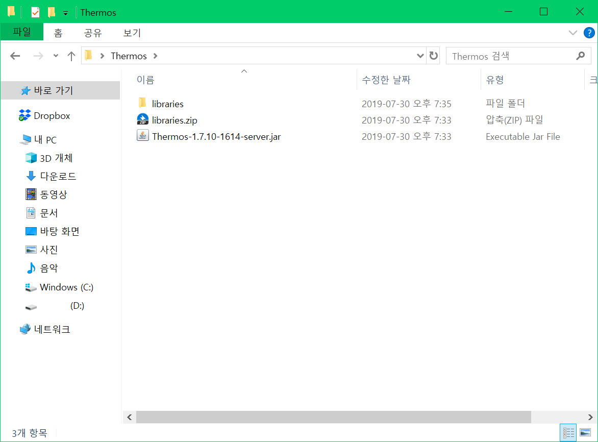 Thermos-1.7.10-XXXX-server가 있는 폴더에 libraries.zip를 압축 해제해 줍니다. 압축을 풀은 후에는 libraries.zip를 삭제하고 Thermos-1.7.10-XXXX-server의 이름을 server로 바꿔 server 파일과 libraries 폴더만 남깁니다.