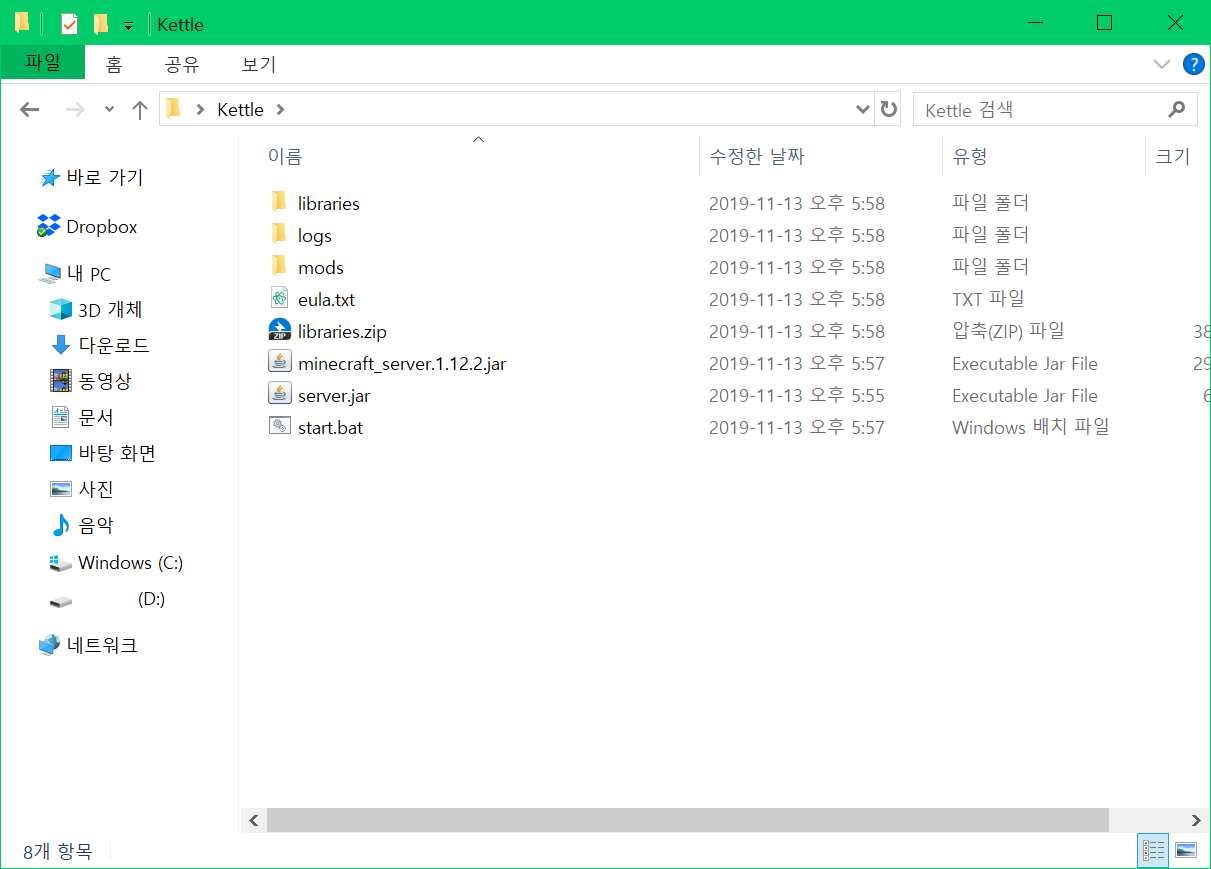 다운로드한 kettle-git-HEAD-XXXXXXX-universal.jar의 이름을 server로 바꿔준 후 마인크래프트 서버 강좌 3-3 배치파일(bat) 만들기를 보고 start.bat을 만든 다음 실행시키면 위와 같이 Kettle 라이브러리가 다운로드됩니다. eula에 동의해준 후 다시 start.bat를 실행해주면 서버가 열립니다.