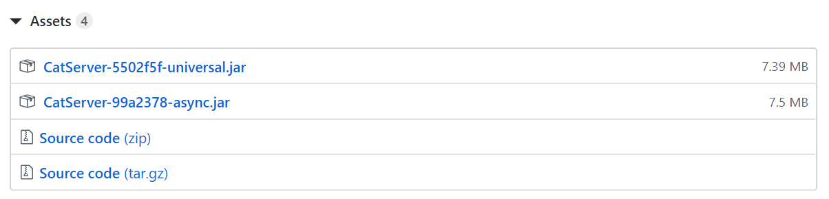 CatServer 공식 GitHub 다운로드 페이지에 들어가 최신 릴리스 하단의 Assets를 눌러 파일들을 보이게 한 후 CatServer-XXXXXXX-universal.jar를 눌러 다운로드해 줍니다.