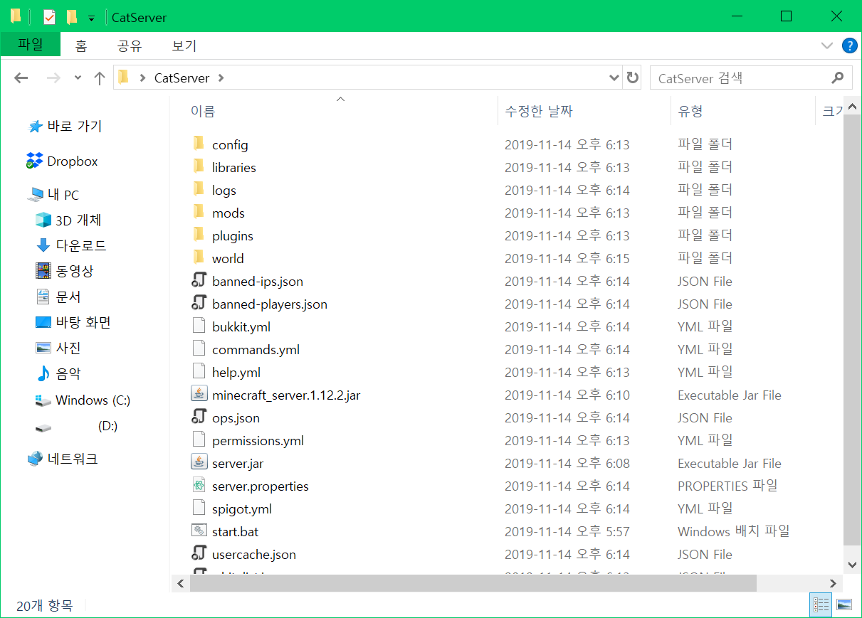 다운로드한 CatServer-XXXXXXX-universal.jar의 이름을 server로 바꿔준 후 마인크래프트 서버 강좌 3-3 배치파일(bat) 만들기를 보고 start.bat을 만든 다음 실행시키면 위와 같이 CatServer 라이브러리가 다운로드 되고 서버가 열립니다.