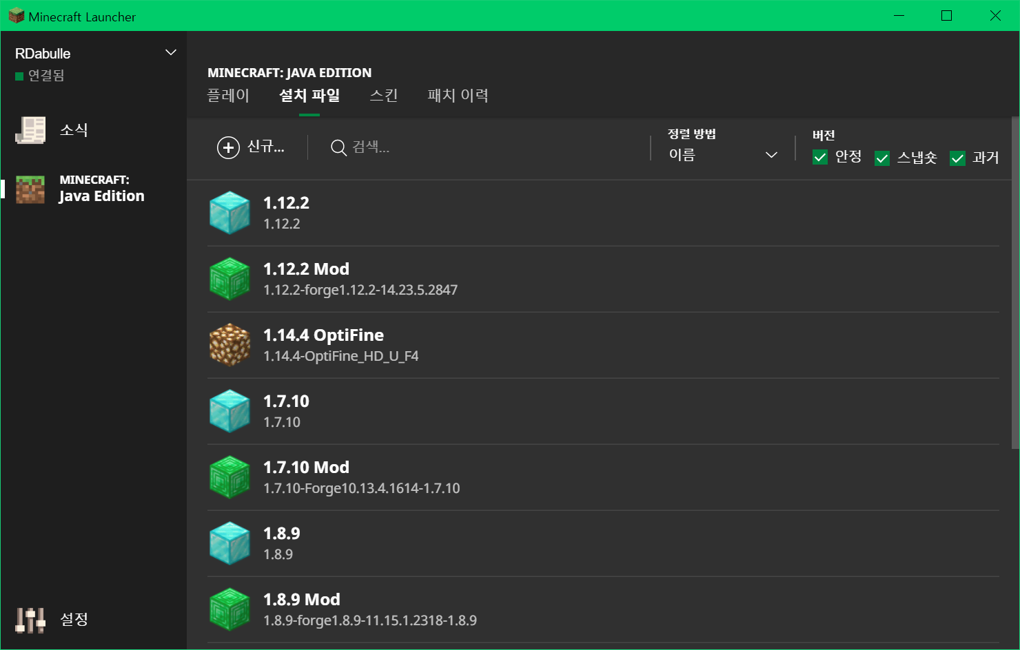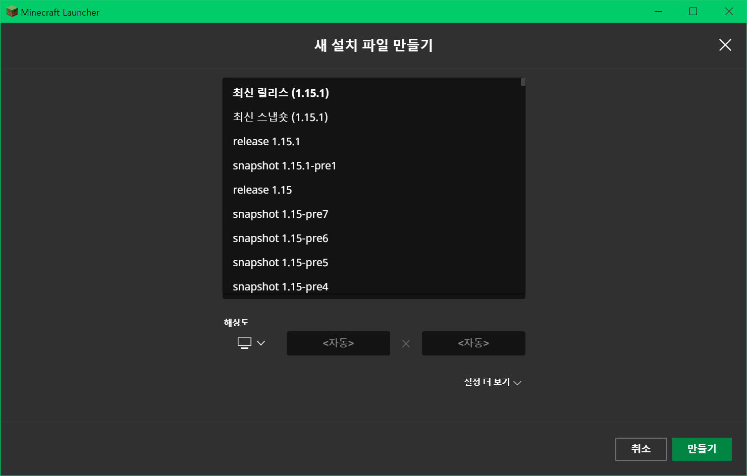 체크 후 새 설치 파일 만들기에서 원하는 버전을 선택하고 만들기 버튼을 눌러 플레이합니다.