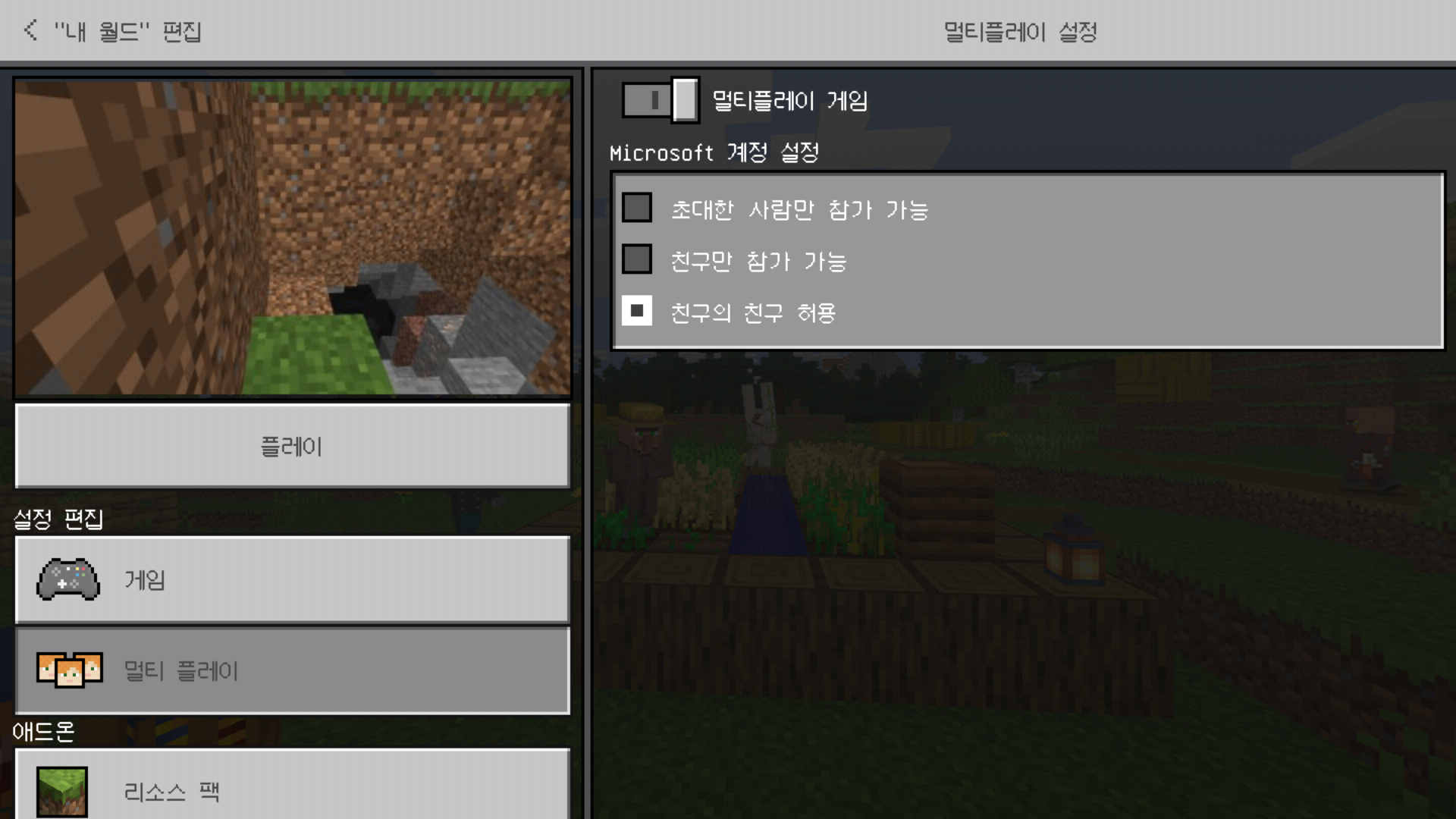 맵의 멀티플레이 설정에서 멀티플레이 게임을 켜고 Microsoft 계정 설정을 한 후 맵에 들어가줍니다.