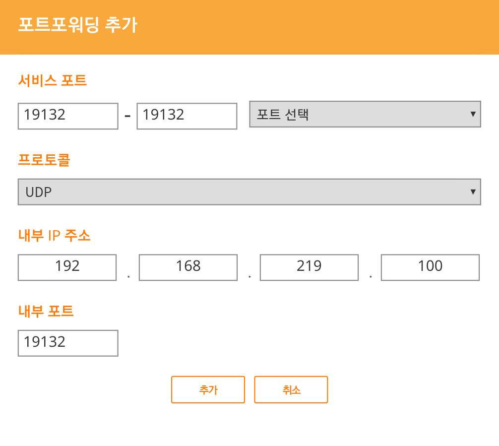 포트는 19132, 프로토콜은 UDP로 적고, 내부 IP 주소에 네트워크 설정 관리에서 나온 IP 주소를 적어 추가해줍니다. 포트포워딩이 완료되면 외부 아이피로 접속할 수 있게 됩니다. 자신의 외부 IP 확인하기