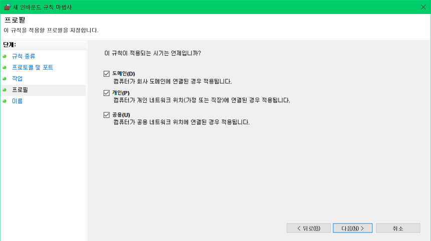 일부 블로그에서는 아예 방화벽을 사용 안 함으로 변경하라고 합니다. 하지만 그것은 친구를 집에 들이기 위해 집 문을 모두 열어두는 것과 같은 매우 위험한 방법이므로 꼭 예외 접속 허용 규칙을 만들어 접속을 허용해 줘야 합니다.