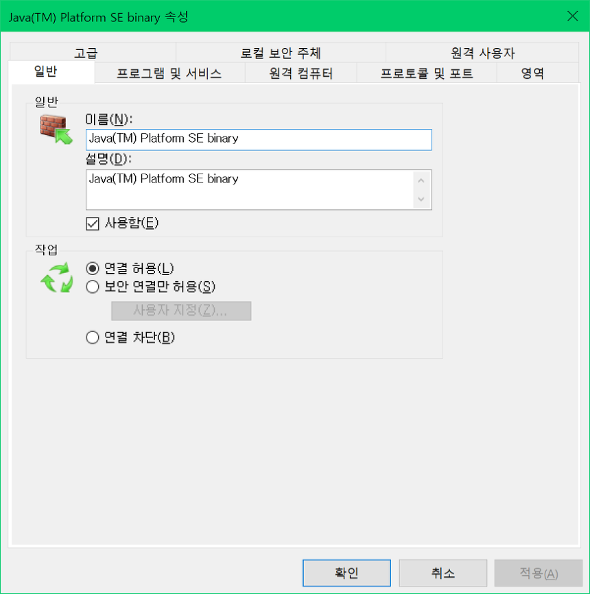 왼쪽 위에 있는 인바운드 규칙을 누른 후 Java(TM) Platform SE binary라고 적혀있는 규칙들을 모두 더블 클릭해 연결 허용(L)을 선택하고 확인을 눌러줍니다.