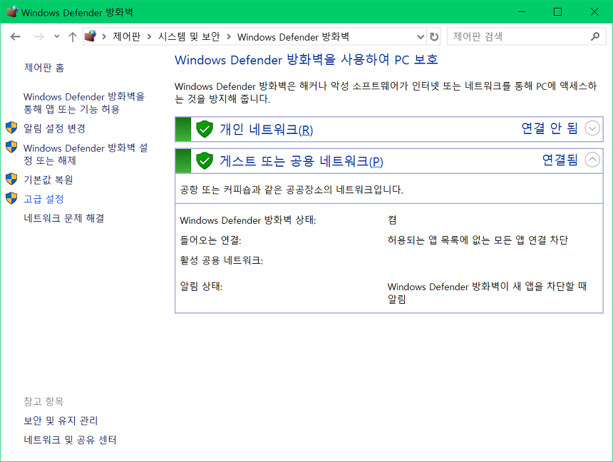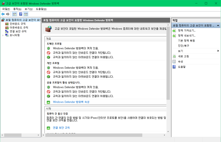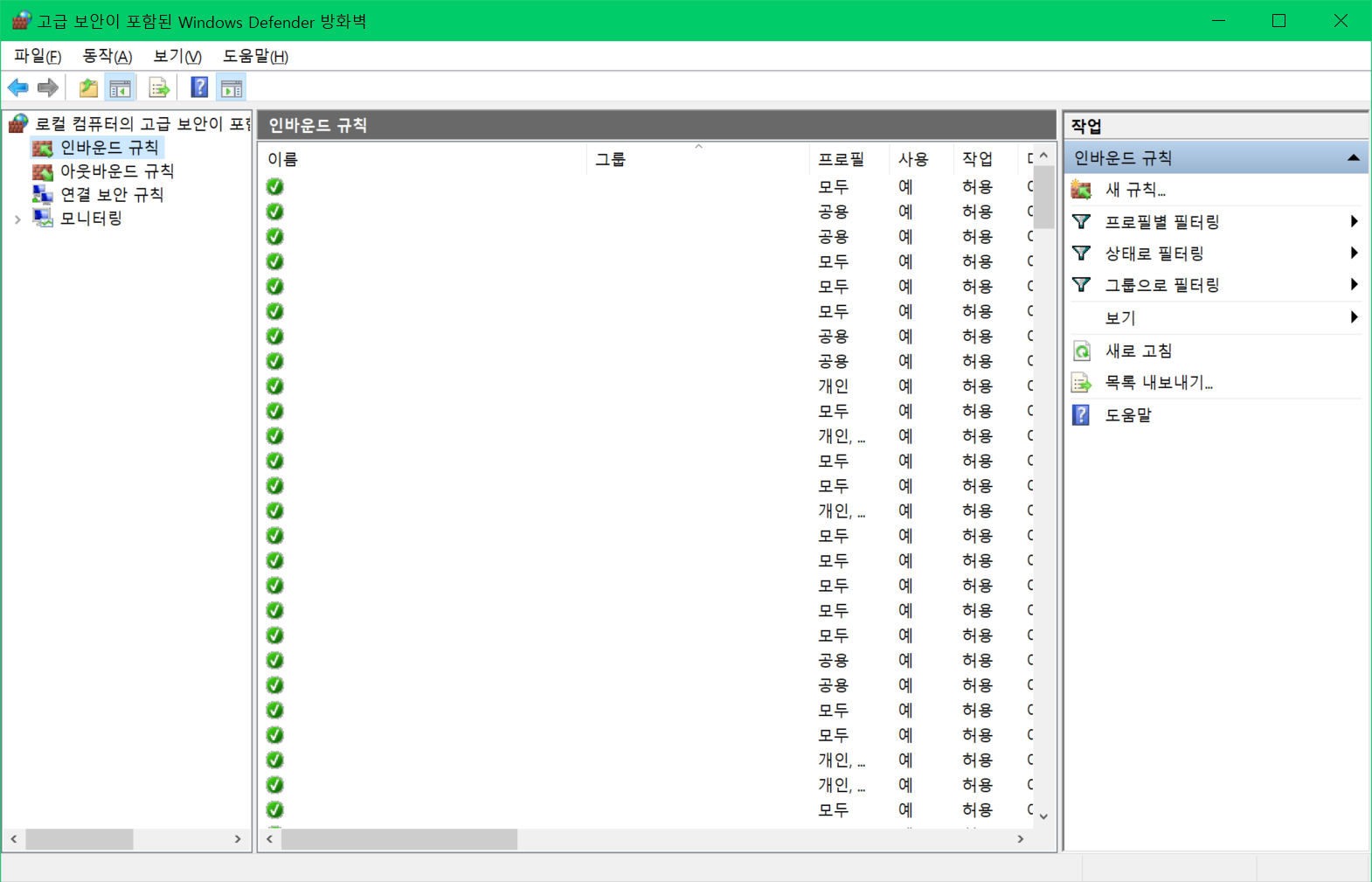 제어판 > 시스템 및 보안 > Windows Defender 방화벽 > 고급 설정에 들어가 줍니다.