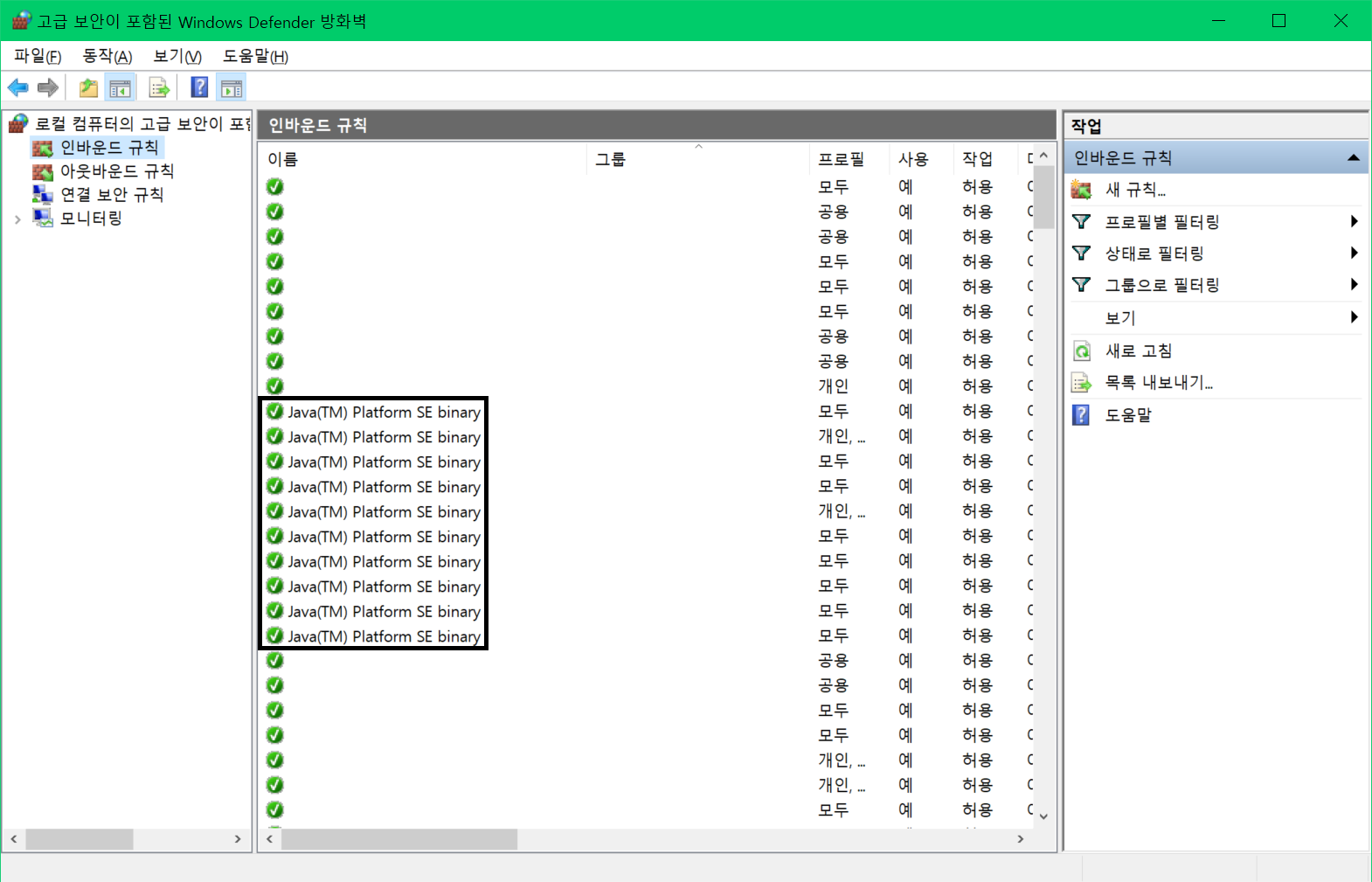 규칙의 수는 사람마다 다를 수 있으며 만약 Java(TM) Platform SE binary라고 적혀있는 규칙이 하나도 없다면 설정하지 않아도 됩니다.