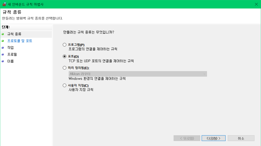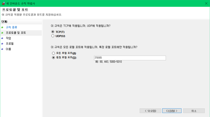 TCP(T)와 특정 로컬 포트(S)를 선택하고 포트 입력 칸에 자신이 설정한 서버의 포트를 입력해줍니다.