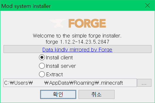 Install client를 선택하고 ... 을 눌러 마인크래프트 라이브러리 폴더를 선택해 준 후 확인을 눌러 설치해 줍니다. (기본 경로 C:\Users\사용자 이름\AppData\Roaming\.minecraft)