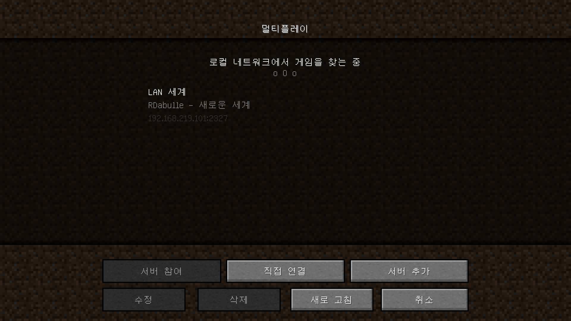 멀티플레이에 들어가면 LAN 서버를 연 플레이어의 이름과 월드의 이름이 나옵니다. 들어갈 LAN 서버를 선택하고 서버 참여 버튼을 누르면 서버에 들어가집니다.